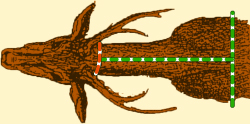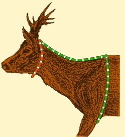 - Nun führen Sie einen weiteren Schnitt beginnend zwischen den Schulterblättern entlang des Trägers bis zwischen die Lauscher und lösen die Haut dann links und rechts vom Träge ab. Nun den in der Kopfhaut verbleibenden Schädel innen vom übrigen Wildkörper abtrennen und Kopf mit Trägerhaut einfrieren oder unverzüglich zu mir bringen bzw. schicken. Sollte dies, z.B. während einer Jagdreise im Ausland nicht möglich sein, muß die Haut komplett vom Schädel gelöst und vorkonserviert werden.